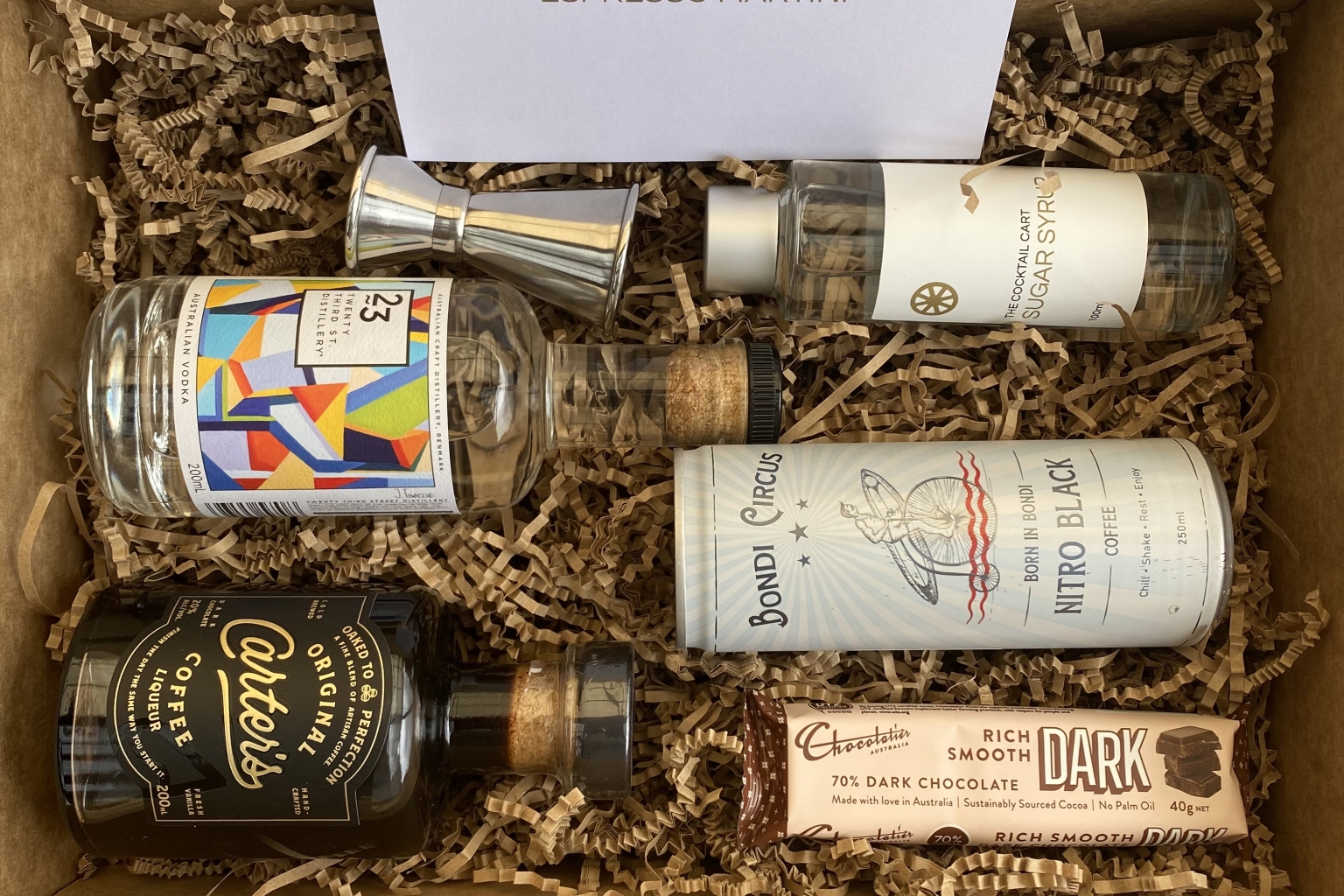 Designed to serve six people, each box comes with Australian ingredients required to make your chosen cocktail. You’ll find alcohol and liqueur, sugar syrups, fruit, mixers, cold brew coffee (for espresso martini), garnishes, a 15/30ml Japanese jigger and, of course, a recipe card.