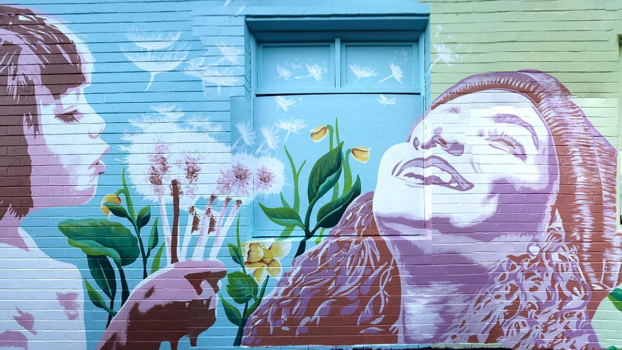 The mural features three life-like faces: the pink muse depicting a woman fighting breast cancer, a green beanie muse depicting a survivor of brain cancer and the final angelic face of an innocent child, blowing a dandelion as a wish of hope for the other two muses.