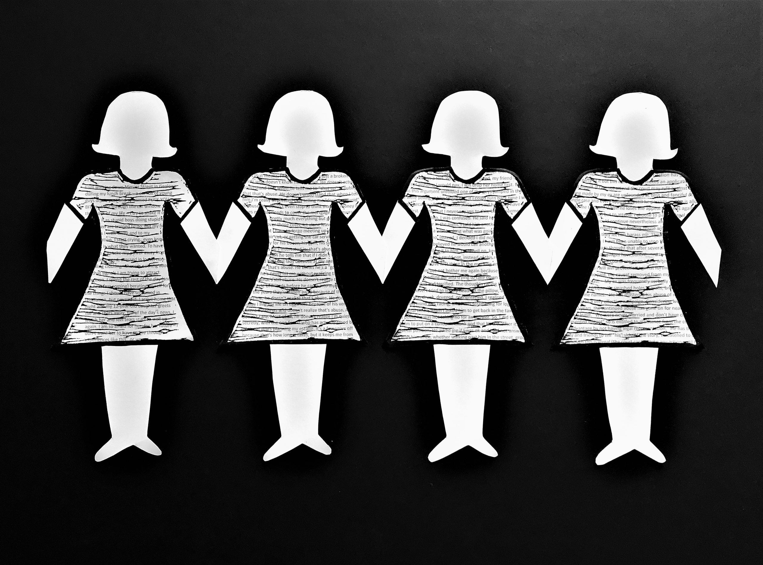 Titled ‘Paper Women’, the aim of the artwork is to connect women and ensure that all stories are heard, shining a light on people who are typically powerless in situations of abuse and give the power back to them. The ‘Paper Women’ piece will be a paper chain of female figures, all wearing dresses printed with the stories of abuse and trauma that Amanda has received from her anonymous female participants.