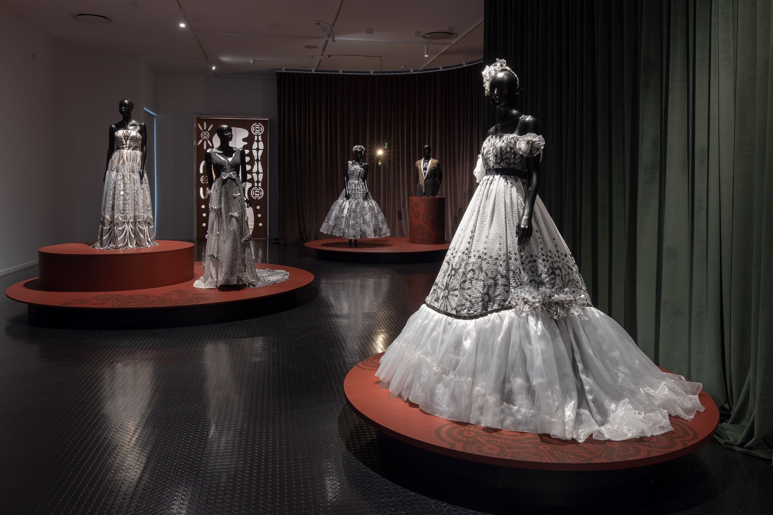 Paul McCann’s The Debutante is an immediate showstopper. The Marrithiyel fashion designer reclaims the colonial ritual of debutante balls, spaces historically used to enforce rigid gender, racial and social codes. Studio Bright transforms the gallery into a ballroom, within which McCann presents garments that shimmer with defiance and reverence. Central is a painstaking recreation of his grandmother Elizabeth Clarke’s 1952 debutante dress from Darwin. From this deeply personal foundation, McCann builds a series of works that weaponise glamour itself, turning European fashion traditions into acts of protest, reclamation and cultural pride.