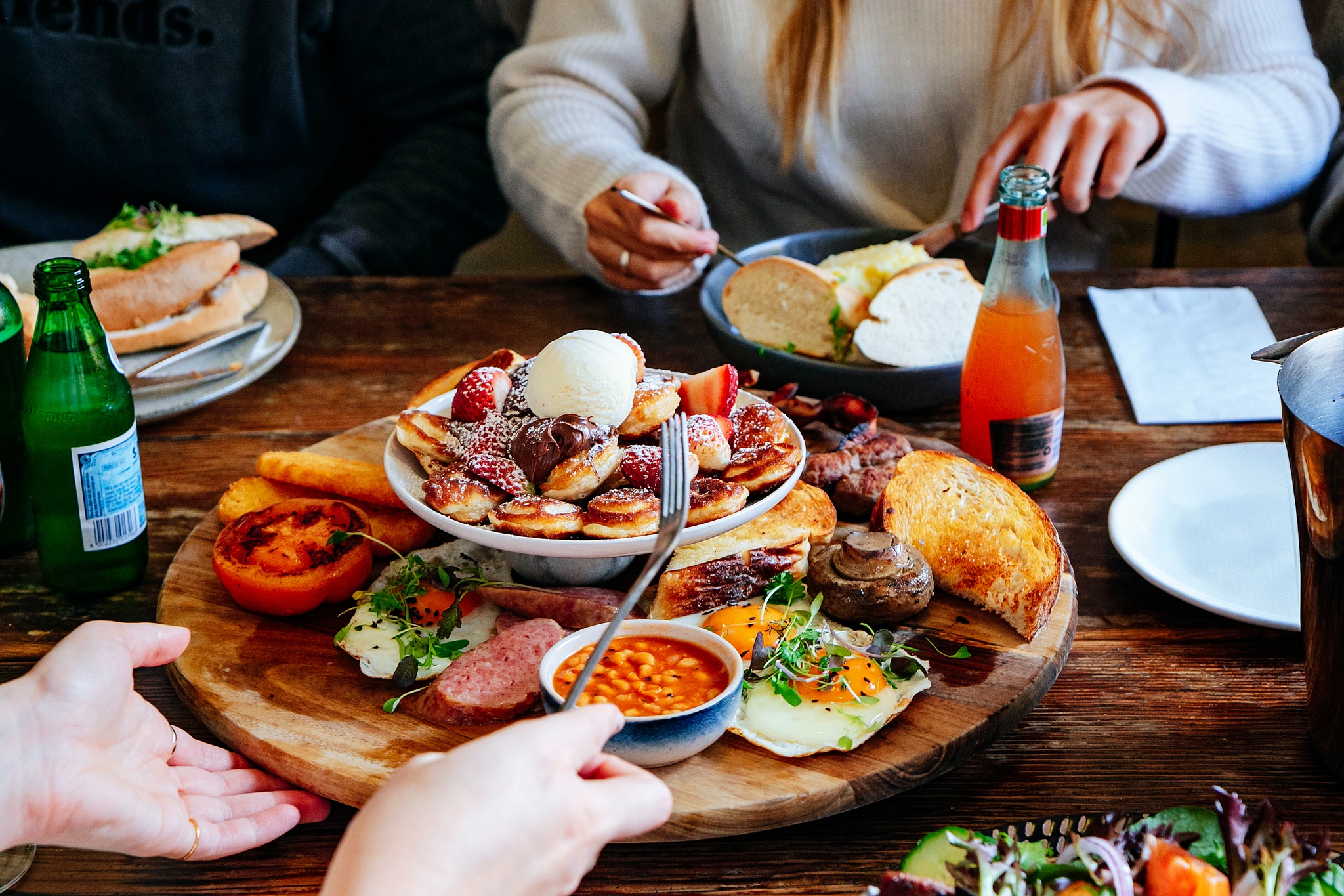 The aptly titled ‘Ultimate Breakfast Platter’ boasts eggs your way, bacon, krajnski sausage, ćevapi, mushroom, tomato, beans, hash browns and dutch pancakes, with your choice of toppings. There’s lemon and sugar, fresh strawberries, jam and cream, Nutella and ice cream, or maple syrup and ice cream! Honestly, we’d eat this every day if we could.